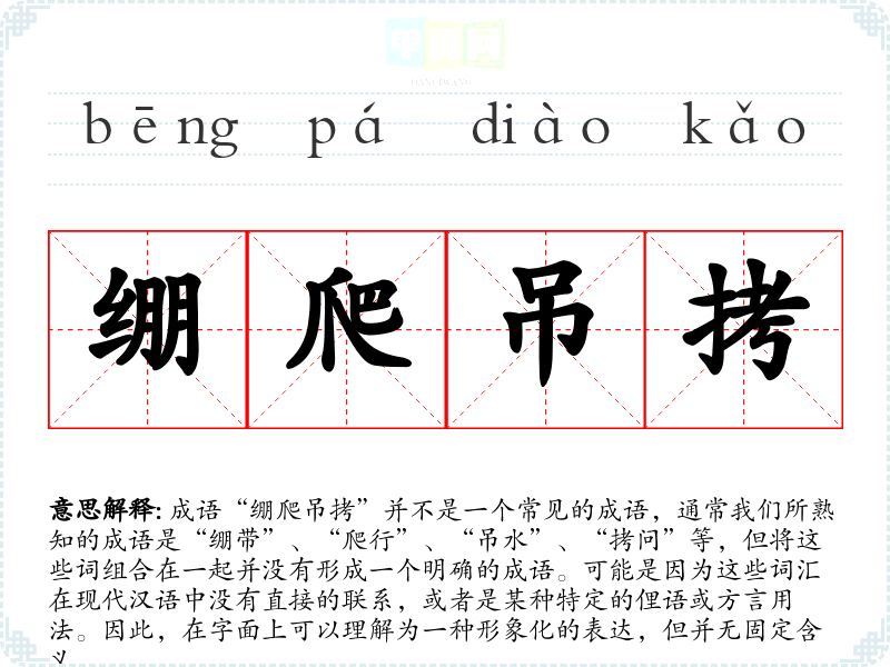 成语“绷爬吊拷”并不是一个常见的成语,通常我们所熟知的成语是“绷带”、“爬行”、“吊水”、“拷问”等,但将这些词组合在一起并没有形成一个明确的成语。可能是因为这些词汇在现代汉语中没有直接的联系,或者是某种特定的俚语或方言用法。因此,在字面上可以理解为一种形象化的表达,但并无固定含义。