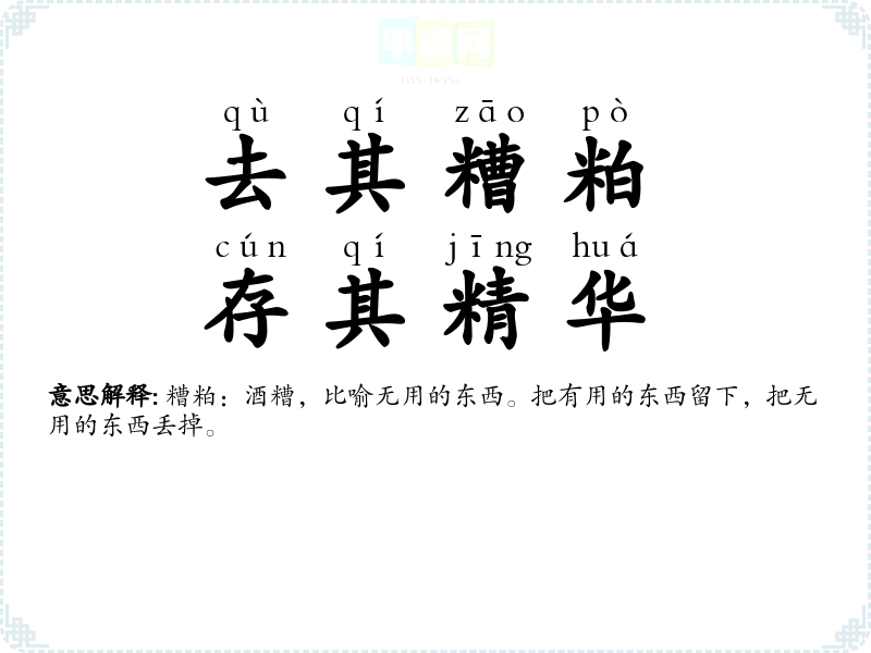 | 去其糟粕,存其精华 | 糟粕:酒糟,比喻无用的东西。把有用的东西留下,把无用的东西丢掉。 |