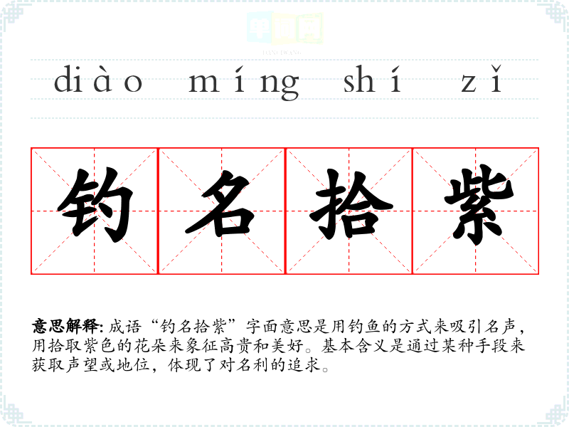 成语“钓名拾紫”字面意思是用钓鱼的方式来吸引名声,用拾取紫色的花朵来象征高贵和美好。基本含义是通过某种手段来获取声望或地位,体现了对名利的追求。