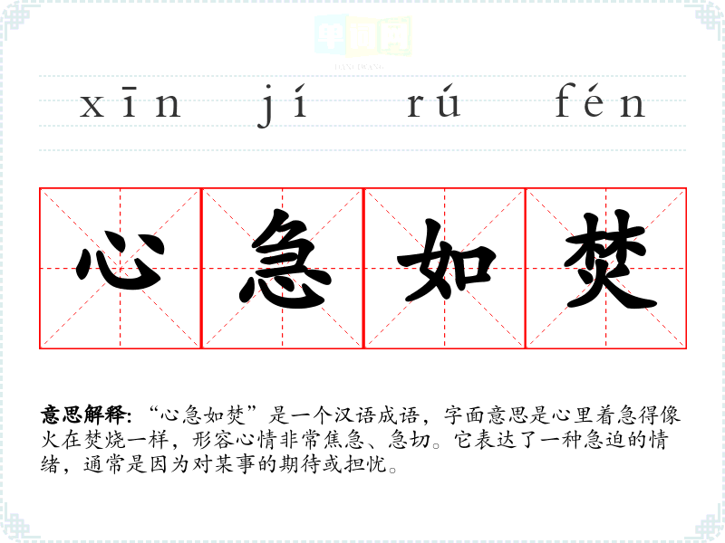 “心急如焚”是一个汉语成语,字面意思是心里着急得像火在焚烧一样,形容心情非常焦急、急切。它表达了一种急迫的情绪,通常是因为对某事的期待或担忧。