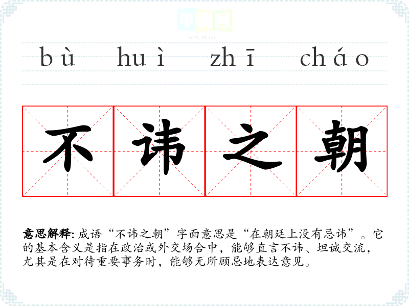 成语“不讳之朝”字面意思是“在朝廷上没有忌讳”。它的基本含义是指在政治或外交场合中,能够直言不讳、坦诚交流,尤其是在对待重要事务时,能够无所顾忌地表达意见。