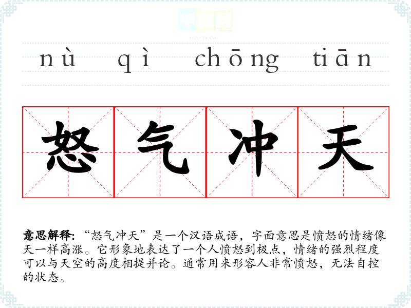 “怒气冲天”的具体来源并没有明确的历史记载,但“怒气”这个词在古代文献中多次出现,常常用来描述一个人愤怒的状态。“冲天”则是一个常见的描绘高度的词汇,合在一起表达了愤怒的极端程度。这个成语在文学作品中有着广泛的运用,通过对愤怒情绪的夸张表现,增强了语言的表现力。