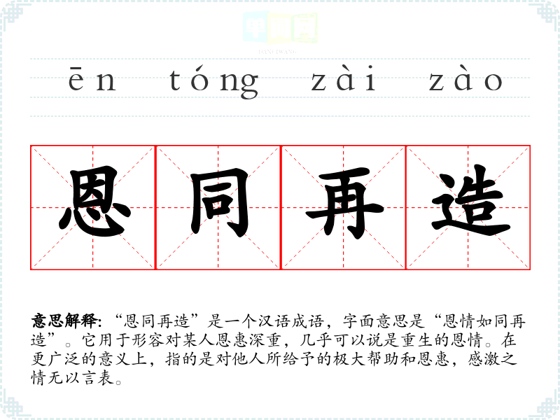 “恩同再造”让我联想到深厚的人际关系和无私的帮助。它传达出一种温暖和感动的情感,让人意识到在生活中,有多少人愿意在背后默默支持我们。正是这种恩情,构成了我们生活的美好。
