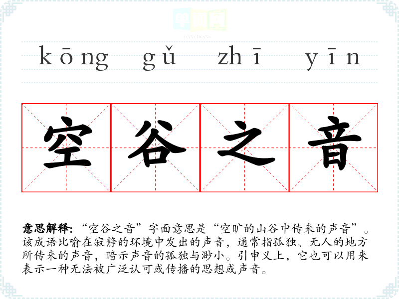 “空谷之音”字面意思是“空旷的山谷中传来的声音”。该成语比喻在寂静的环境中发出的声音,通常指孤独、无人的地方所传来的声音,暗示声音的孤独与渺小。引申义上,它也可以用来表示一种无法被广泛认可或传播的思想或声音。