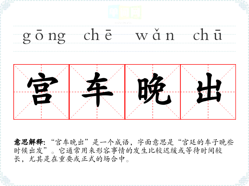 “宫车晚出”是一个成语,字面意思是“宫廷的车子晚些时候出发”。它通常用来形容事情的发生比较迟缓或等待时间较长,尤其是在重要或正式的场合中。