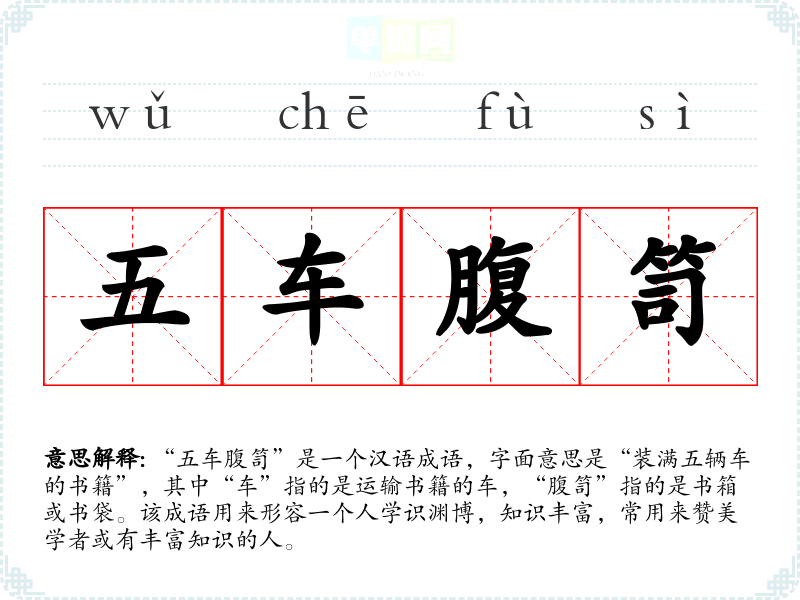 “五车腹笥”是一个汉语成语,字面意思是“装满五辆车的书籍”,其中“车”指的是运输书籍的车,“腹笥”指的是书箱或书袋。该成语用来形容一个人学识渊博,知识丰富,常用来赞美学者或有丰富知识的人。