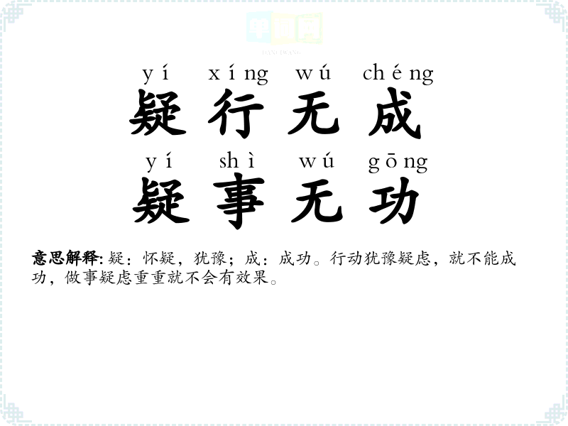 | 疑事无功,疑行无名 | 疑:疑虑。行动有疑虑就不会成功,做事有疑虑就没有效果 |