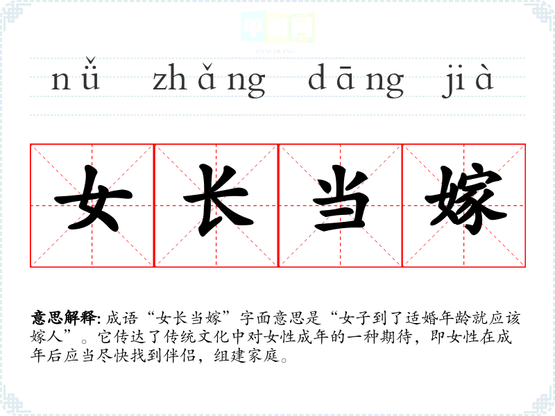 成语“女长当嫁”字面意思是“女子到了适婚年龄就应该嫁人”。它传达了传统文化中对女性成年的一种期待,即女性在成年后应当尽快找到伴侣,组建家庭。