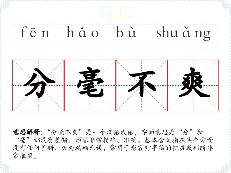 | 分毫不爽 | 分毫:数量单位,十丝为一毫,十毫为一厘,十厘为一分。比喻没有丝毫差错。 |