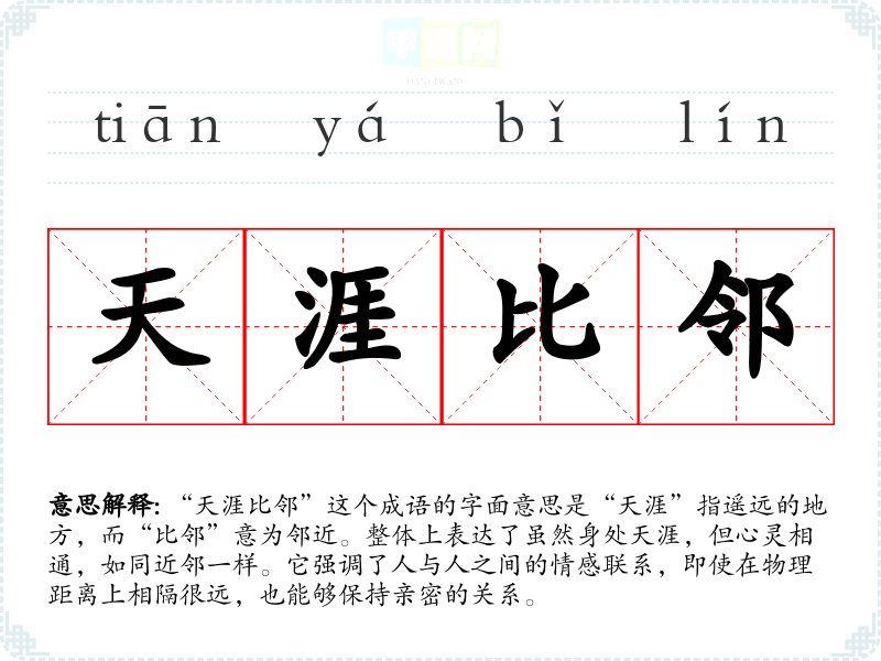 “天涯比邻”这个成语的字面意思是“天涯”指遥远的地方,而“比邻”意为邻近。整体上表达了虽然身处天涯,但心灵相通,如同近邻一样。它强调了人与人之间的情感联系,即使在物理距离上相隔很远,也能够保持亲密的关系。