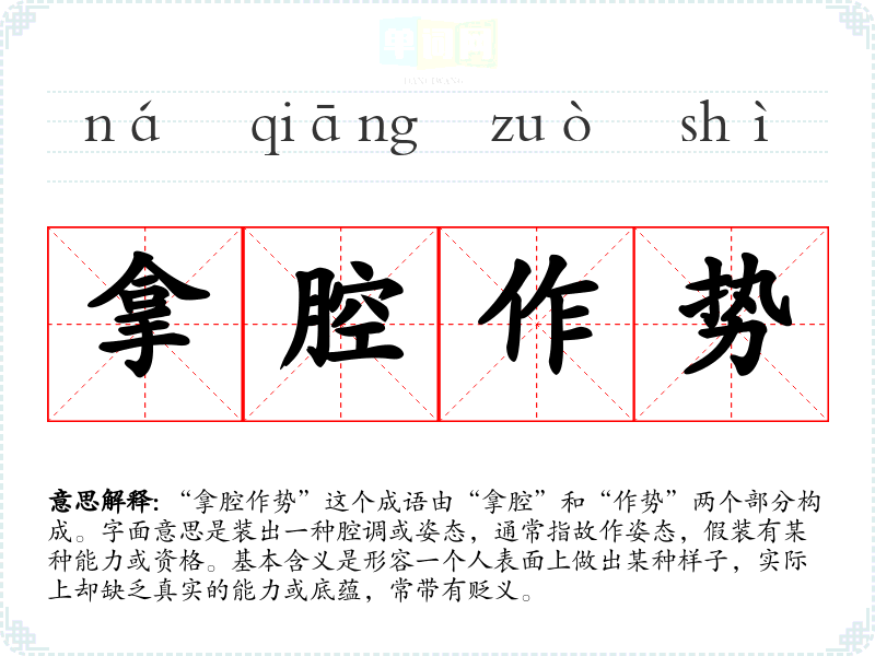 “拿腔作势”这个成语由“拿腔”和“作势”两个部分构成。字面意思是装出一种腔调或姿态,通常指故作姿态,假装有某种能力或资格。基本含义是形容一个人表面上做出某种样子,实际上却缺乏真实的能力或底蕴,常带有贬义。