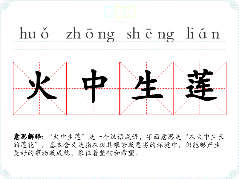 “火中生莲”是一个汉语成语,字面意思是“在火中生长的莲花”。基本含义是指在极其艰苦或恶劣的环境中,仍能够产生美好的事物或成就,象征着坚韧和希望。