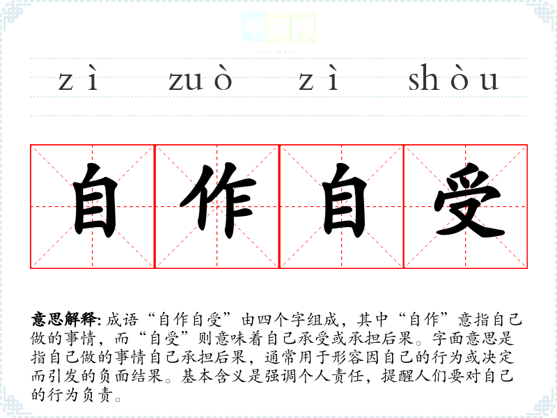成语“自作自受”由四个字组成,其中“自作”意指自己做的事情,而“自受”则意味着自己承受或承担后果。字面意思是指自己做的事情自己承担后果,通常用于形容因自己的行为或决定而引发的负面结果。基本含义是强调个人责任,提醒人们要对自己的行为负责。