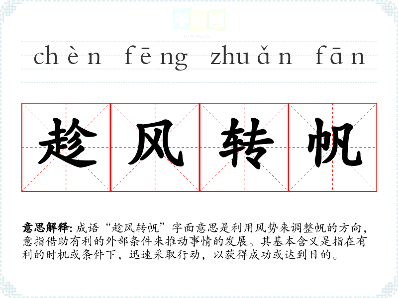 成语“趁风转帆”字面意思是利用风势来调整帆的方向,意指借助有利的外部条件来推动事情的发展。其基本含义是指在有利的时机或条件下,迅速采取行动,以获得成功或达到目的。