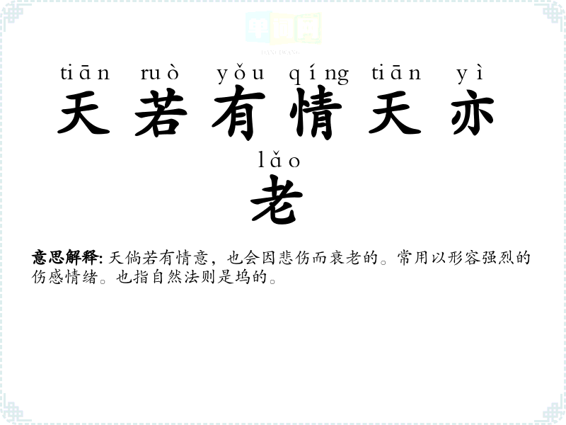 | 天若有情天亦老 | 天倘若有情意,也会因悲伤而衰老的。常用以形容强烈的伤感情绪。也指自然法则是坞的。 |