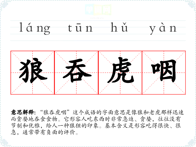 通过对“狼吞虎咽”的学,我认识到这个成语不仅仅用于形容吃得快,更反映了一个人对饮食的态度和礼仪。在语言学和表达中,了解成语的深层含义和文化背景,有助于更准确、丰富地表达自己的思想和情感。