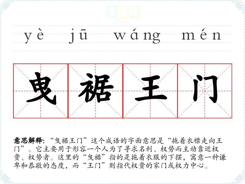 “曳裾王门”这个成语的字面意思是“拖着衣襟走向王门”。它主要用于形容一个人为了寻求名利、权势而主动靠近权贵、权势者。这里的“曳裾”指的是拖着衣服的下摆,寓意一种谦卑和恭敬的态度,而“王门”则指代权贵的家门或权力中心。