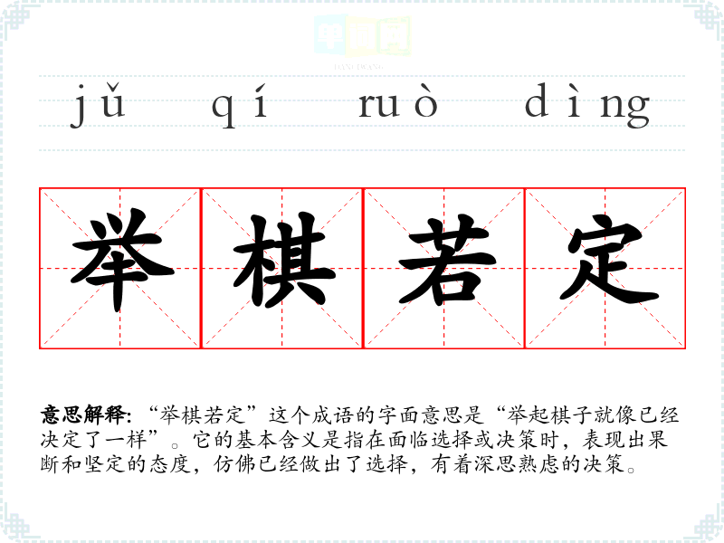 “举棋若定”这个成语的字面意思是“举起棋子就像已经决定了一样”。它的基本含义是指在面临选择或决策时,表现出果断和坚定的态度,仿佛已经做出了选择,有着深思熟虑的决策。