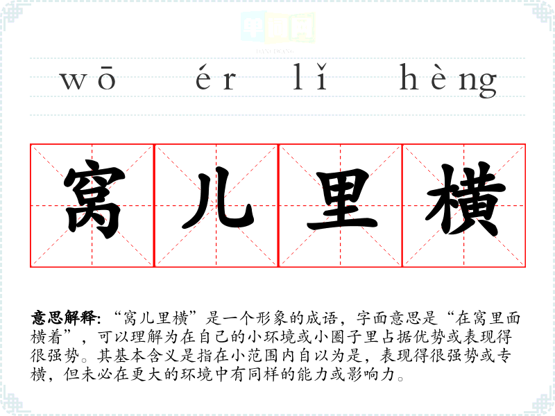 “窝儿里横”是一个形象的成语,字面意思是“在窝里面横着”,可以理解为在自己的小环境或小圈子里占据优势或表现得很强势。其基本含义是指在小范围内自以为是,表现得很强势或专横,但未必在更大的环境中有同样的能力或影响力。