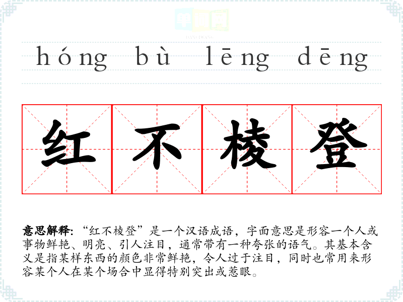 “红不棱登”是一个汉语成语,字面意思是形容一个人或事物鲜艳、明亮、引人注目,通常带有一种夸张的语气。其基本含义是指某样东西的颜色非常鲜艳,令人过于注目,同时也常用来形容某个人在某个场合中显得特别突出或惹眼。