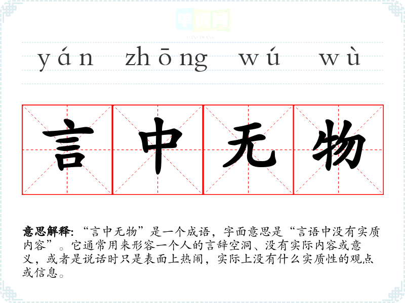 “言中无物”是一个成语,字面意思是“言语中没有实质内容”。它通常用来形容一个人的言辞空洞、没有实际内容或意义,或者是说话时只是表面上热闹,实际上没有什么实质性的观点或信息。