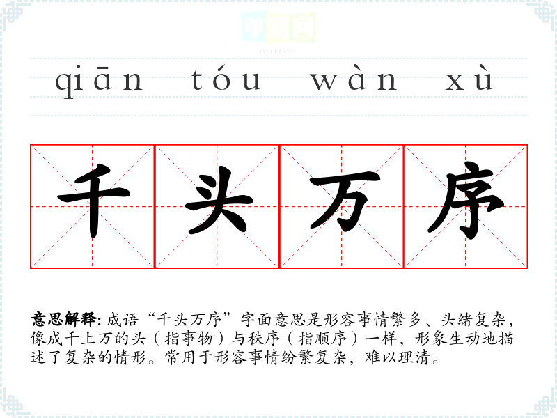- 同义成语:纷繁复杂、错综复杂。这些成语都表达了事情的复杂性,但“千头万序”更强调事物的数量和混乱的程度。
