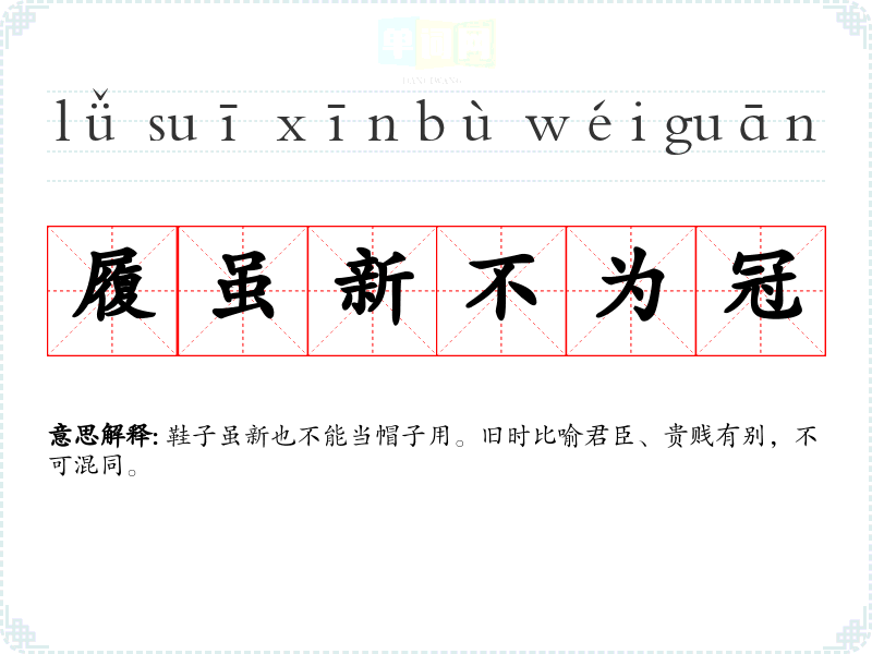 | 履虽新不为冠 | 鞋子虽新也不能当帽子用。旧时比喻君臣、贵贱有别,不可混同。 |