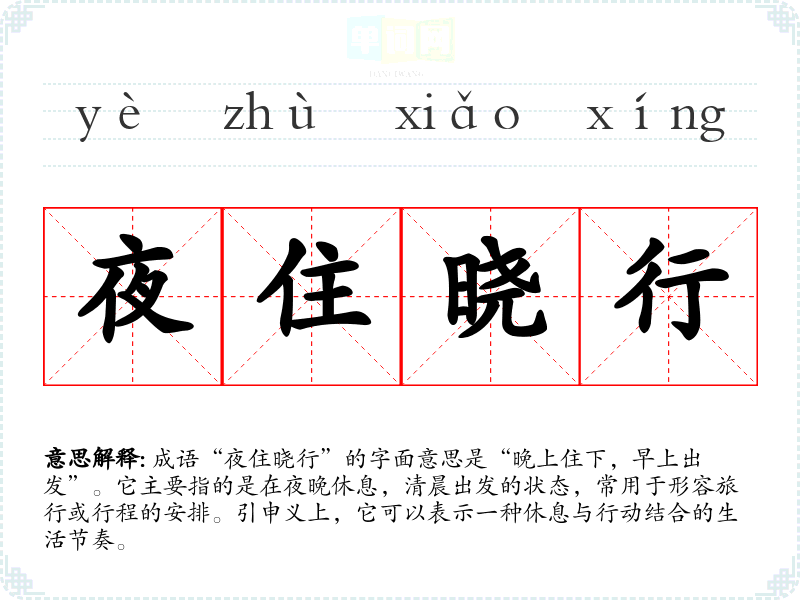 成语“夜住晓行”的字面意思是“晚上住下,早上出发”。它主要指的是在夜晚休息,清晨出发的状态,常用于形容旅行或行程的安排。引申义上,它可以表示一种休息与行动结合的生活节奏。