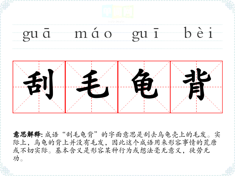 成语“刮毛龟背”的字面意思是刮去乌龟壳上的毛发。实际上,乌龟的背上并没有毛发,因此这个成语用来形容事情的荒唐或不切实际。基本含义是形容某种行为或想法毫无意义,徒劳无功。