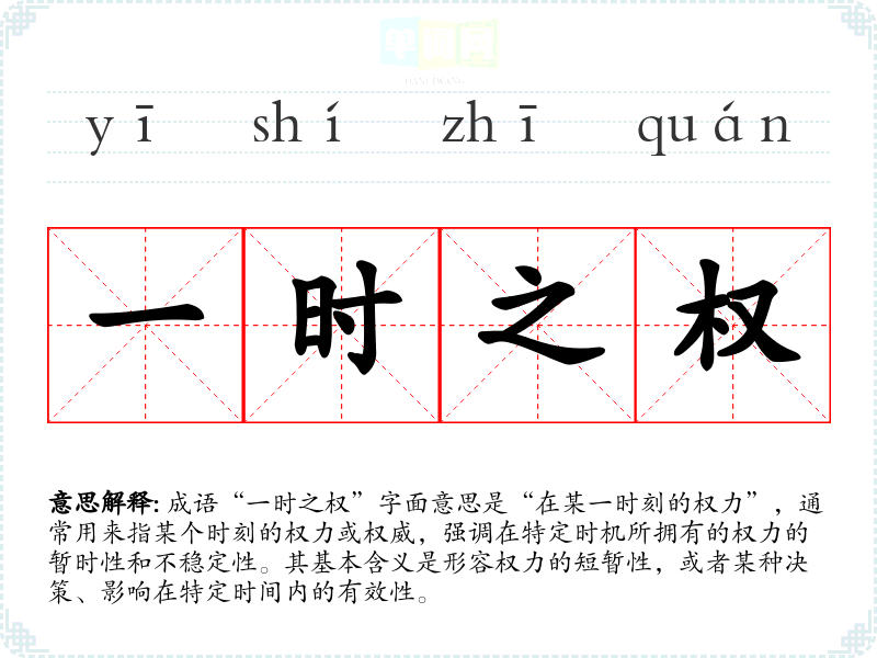 成语“一时之权”字面意思是“在某一时刻的权力”,通常用来指某个时刻的权力或权威,强调在特定时机所拥有的权力的暂时性和不稳定性。其基本含义是形容权力的短暂性,或者某种决策、影响在特定时间内的有效性。