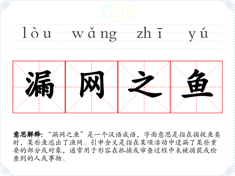 “漏网之鱼”是一个汉语成语,字面意思是指在捕捉鱼类时,某些鱼逃出了渔网。引申含义是指在某项活动中遗漏了某些重要的部分或对象,通常用于形容在抓捕或审查过程中未被捕获或检查到的人或事物。