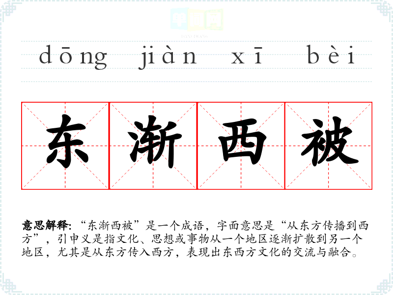 “东渐西被”是一个成语,字面意思是“从东方传播到西方”,引申义是指文化、思想或事物从一个地区逐渐扩散到另一个地区,尤其是从东方传入西方,表现出东西方文化的交流与融合。
