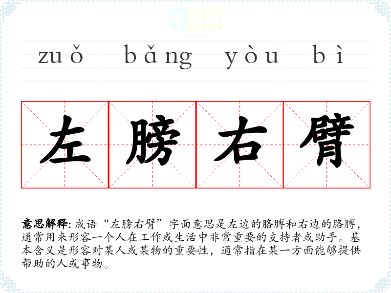 成语“左膀右臂”字面意思是左边的胳膊和右边的胳膊,通常用来形容一个人在工作或生活中非常重要的支持者或助手。基本含义是形容对某人或某物的重要性,通常指在某一方面能够提供帮助的人或事物。
