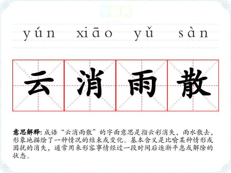 成语“云消雨散”的字面意思是指云彩消失,雨水散去,形象地描绘了一种情况的结束或变化。基本含义是比喻某种情形或困扰的消失,通常用来形容事情经过一段时间后逐渐平息或解除的状态。