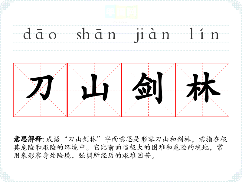 成语“刀山剑林”字面意思是形容刀山和剑林,意指在极其危险和艰险的环境中。它比喻面临极大的困难和危险的境地,常用来形容身处险境,强调所经历的艰难困苦。