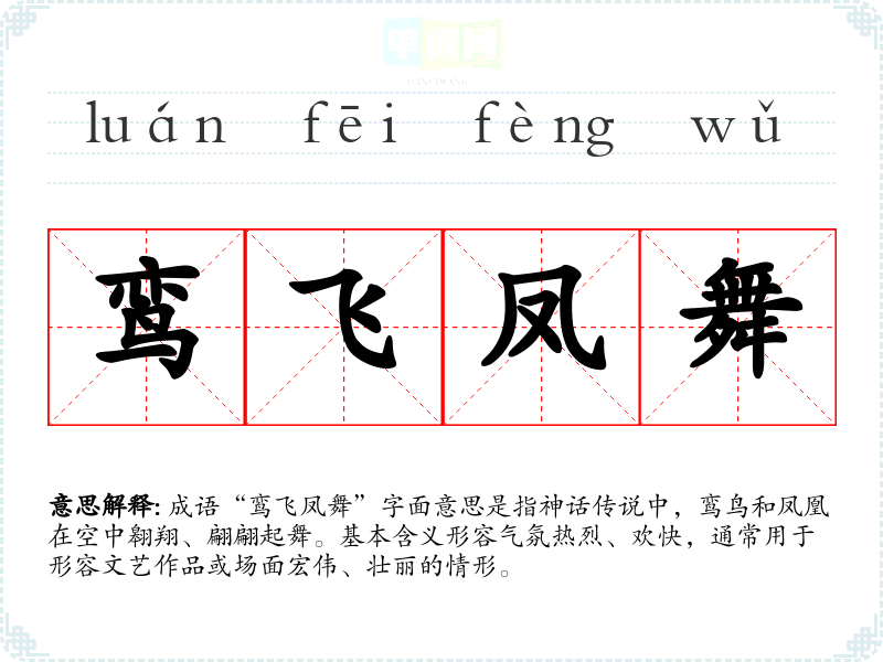 成语“鸾飞凤舞”字面意思是指神话传说中,鸾鸟和凤凰在空中翱翔、翩翩起舞。基本含义形容气氛热烈、欢快,通常用于形容文艺作品或场面宏伟、壮丽的情形。