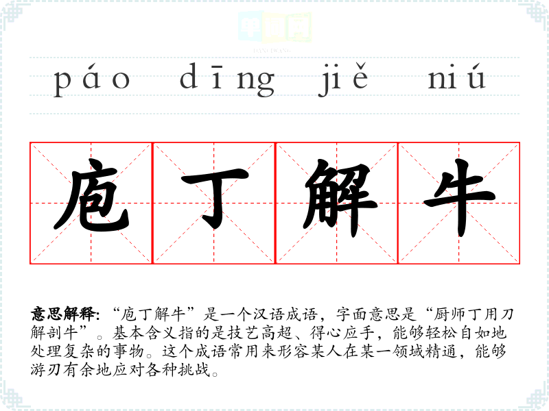 “庖丁解牛”是一个汉语成语,字面意思是“厨师丁用刀解剖牛”。基本含义指的是技艺高超、得心应手,能够轻松自如地处理复杂的事物。这个成语常用来形容某人在某一领域精通,能够游刃有余地应对各种挑战。