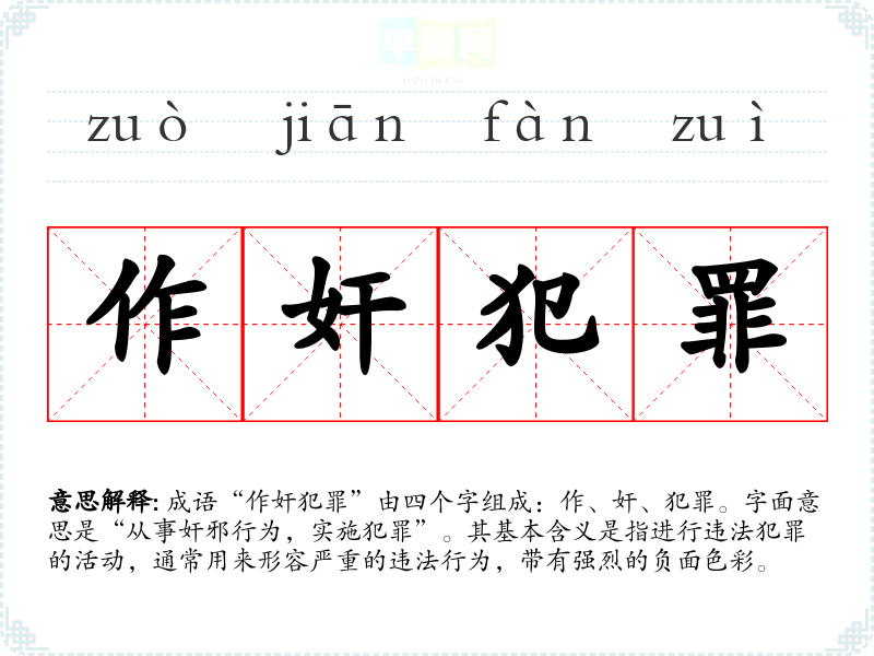 成语“作奸犯罪”由四个字组成:作、奸、犯罪。字面意思是“从事奸邪行为,实施犯罪”。其基本含义是指进行违法犯罪的活动,通常用来形容严重的违法行为,带有强烈的负面色彩。