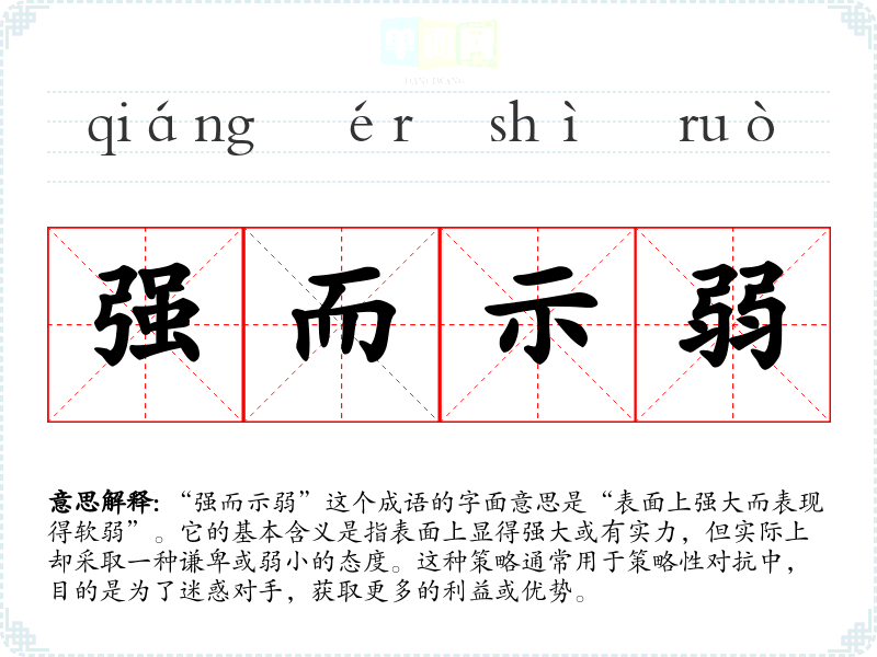 “强而示弱”这个成语的字面意思是“表面上强大而表现得软弱”。它的基本含义是指表面上显得强大或有实力,但实际上却采取一种谦卑或弱小的态度。这种策略通常用于策略性对抗中,目的是为了迷惑对手,获取更多的利益或优势。