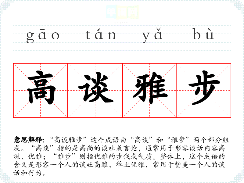 “高谈雅步”这个成语由“高谈”和“雅步”两个部分组成。“高谈”指的是高尚的谈吐或言论,通常用于形容谈话内容高深、优雅;“雅步”则指优雅的步伐或气质。整体上,这个成语的含义是形容一个人的谈吐高雅,举止优雅,常用于赞美一个人的谈话和行为。