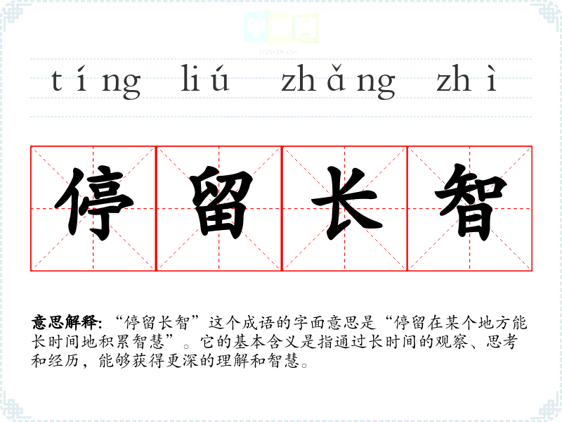 “停留长智”这个成语的字面意思是“停留在某个地方能长时间地积累智慧”。它的基本含义是指通过长时间的观察、思考和经历,能够获得更深的理解和智慧。