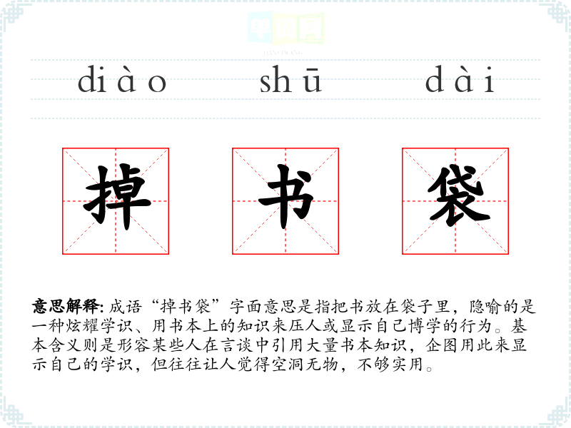 成语“掉书袋”字面意思是指把书放在袋子里,隐喻的是一种炫耀学识、用书本上的知识来压人或显示自己博学的行为。基本含义则是形容某些人在言谈中引用大量书本知识,企图用此来显示自己的学识,但往往让人觉得空洞无物,不够实用。