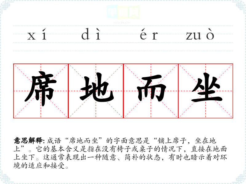 成语“席地而坐”的字面意思是“铺上席子,坐在地上”。它的基本含义是指在没有椅子或桌子的情况下,直接在地面上坐下。这通常表现出一种随意、简朴的状态,有时也暗示着对环境的适应和接受。
