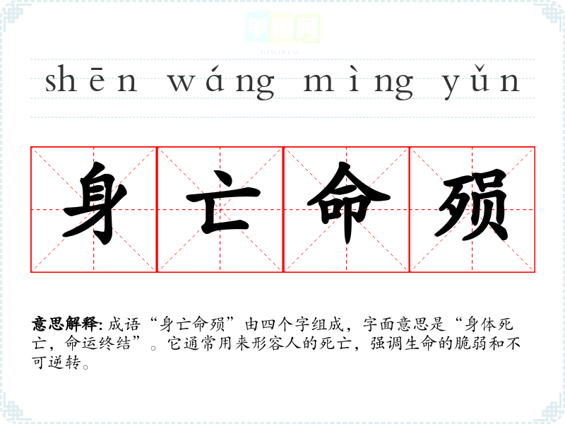 成语“身亡命殒”由四个字组成,字面意思是“身体死亡,命运终结”。它通常用来形容人的死亡,强调生命的脆弱和不可逆转。