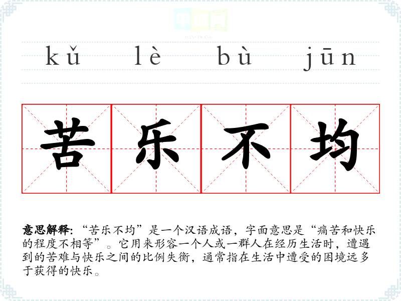 “苦乐不均”是一个汉语成语,字面意思是“痛苦和快乐的程度不相等”。它用来形容一个人或一群人在经历生活时,遭遇到的苦难与快乐之间的比例失衡,通常指在生活中遭受的困境远多于获得的快乐。