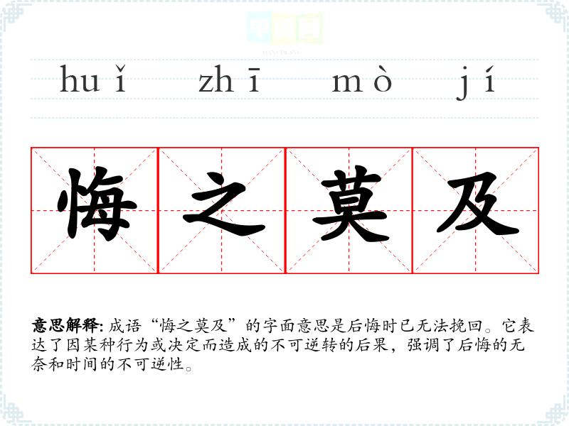 成语“悔之莫及”的字面意思是后悔时已无法挽回。它表达了因某种行为或决定而造成的不可逆转的后果,强调了后悔的无奈和时间的不可逆性。