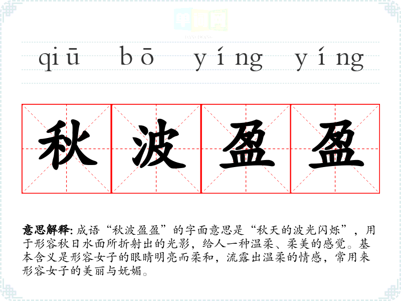 成语“秋波盈盈”的字面意思是“秋天的波光闪烁”,用于形容秋日水面所折射出的光影,给人一种温柔、柔美的感觉。基本含义是形容女子的眼睛明亮而柔和,流露出温柔的情感,常用来形容女子的美丽与妩媚。