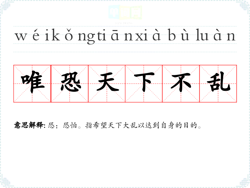 | 唯恐天下不乱 | 恐:恐怕。指希望天下大乱以达到自身的目的。 |