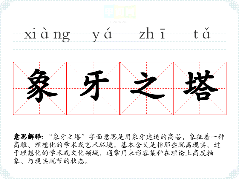 “象牙之塔”字面意思是用象牙建造的高塔,象征着一种高雅、理想化的学术或艺术环境。基本含义是指那些脱离现实、过于理想化的学术或文化领域,通常用来形容某种在理论上高度抽象、与现实脱节的状态。