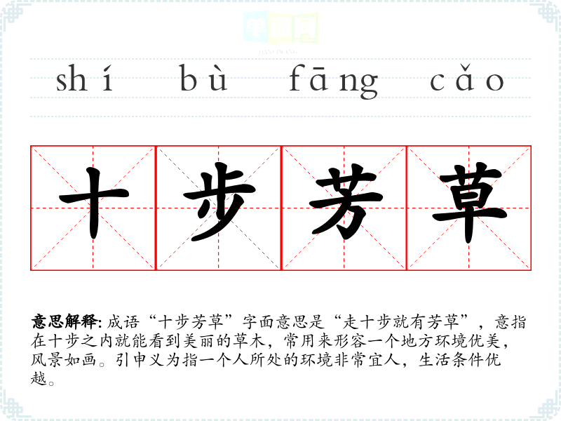 成语“十步芳草”字面意思是“走十步就有芳草”,意指在十步之内就能看到美丽的草木,常用来形容一个地方环境优美,风景如画。引申义为指一个人所处的环境非常宜人,生活条件优越。
